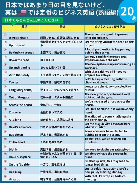 “move the needle”(目に見えた進捗がある) “segue”(話題をスムーズにつなぐ) “down the road”(ゆくゆくは) “across the board”(一律)、——ビジネスの現場で本当によく使われます。